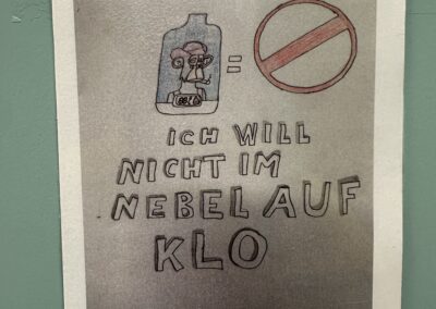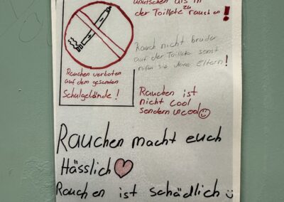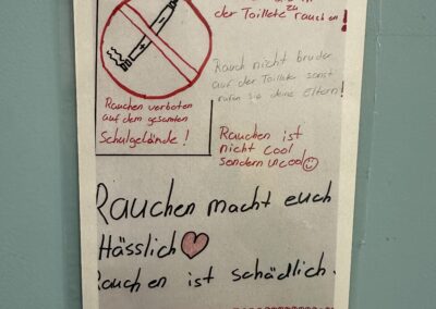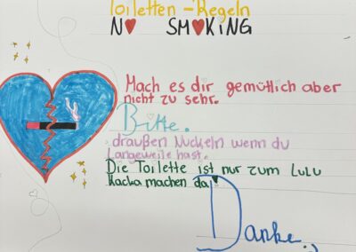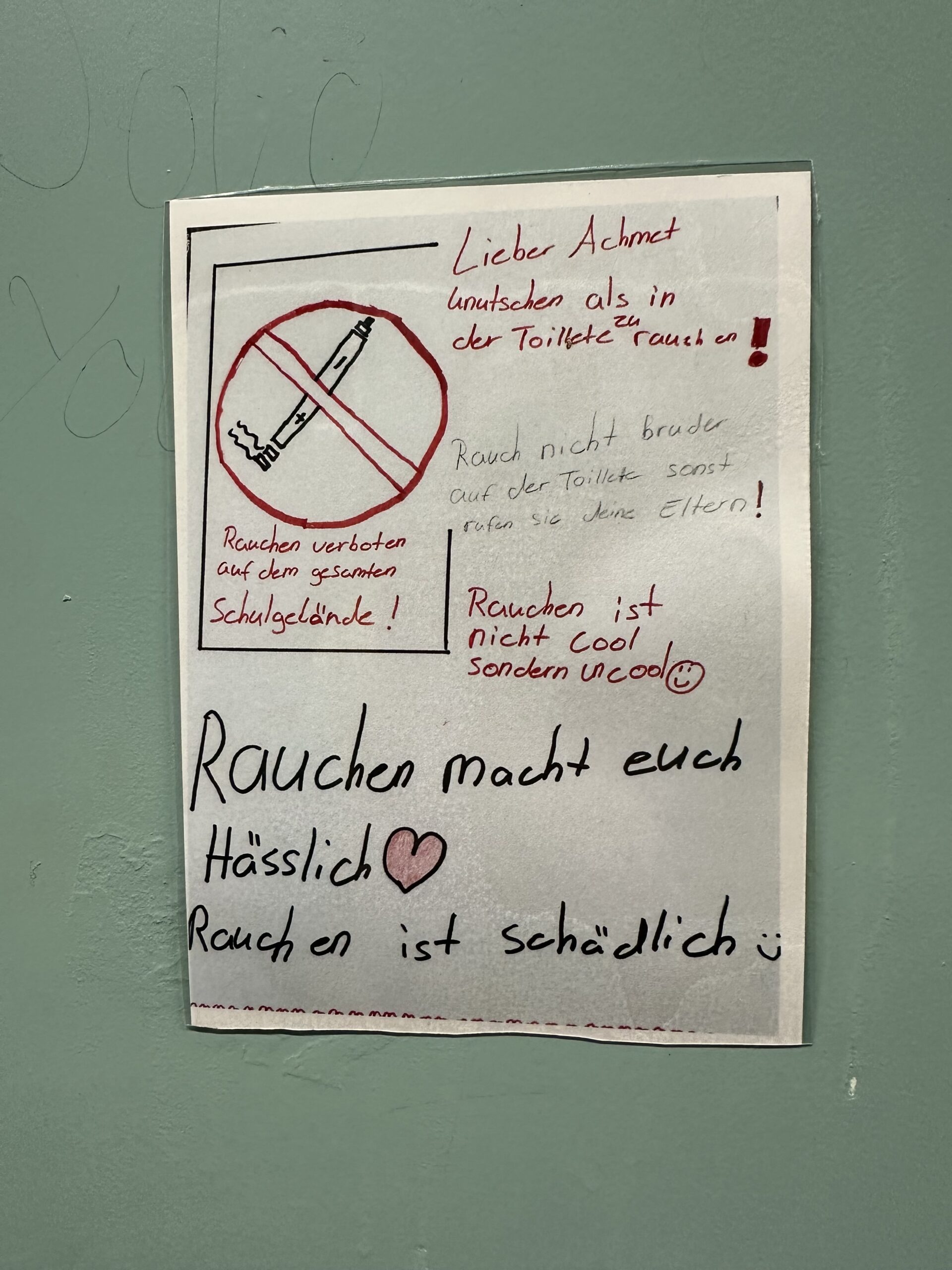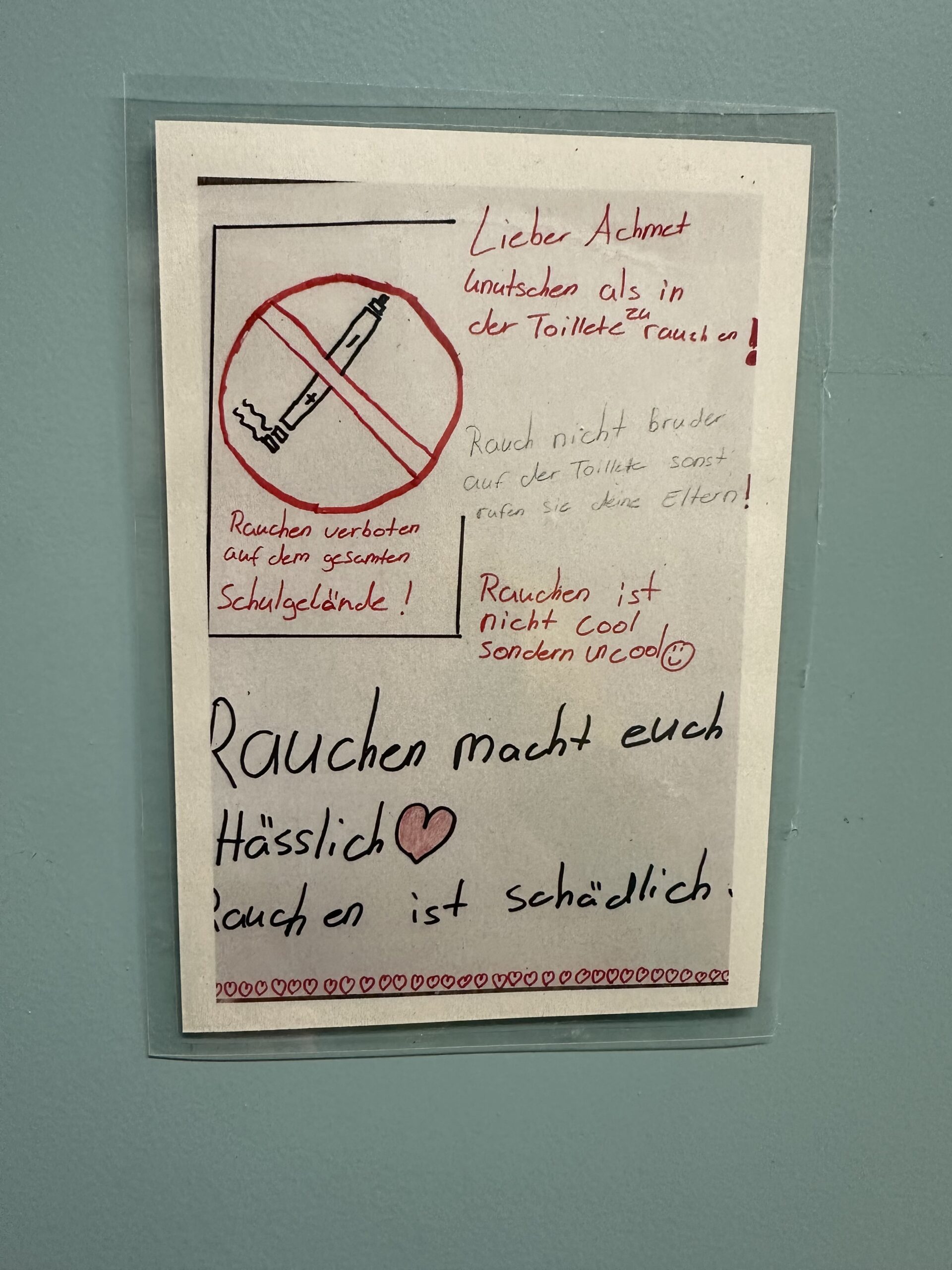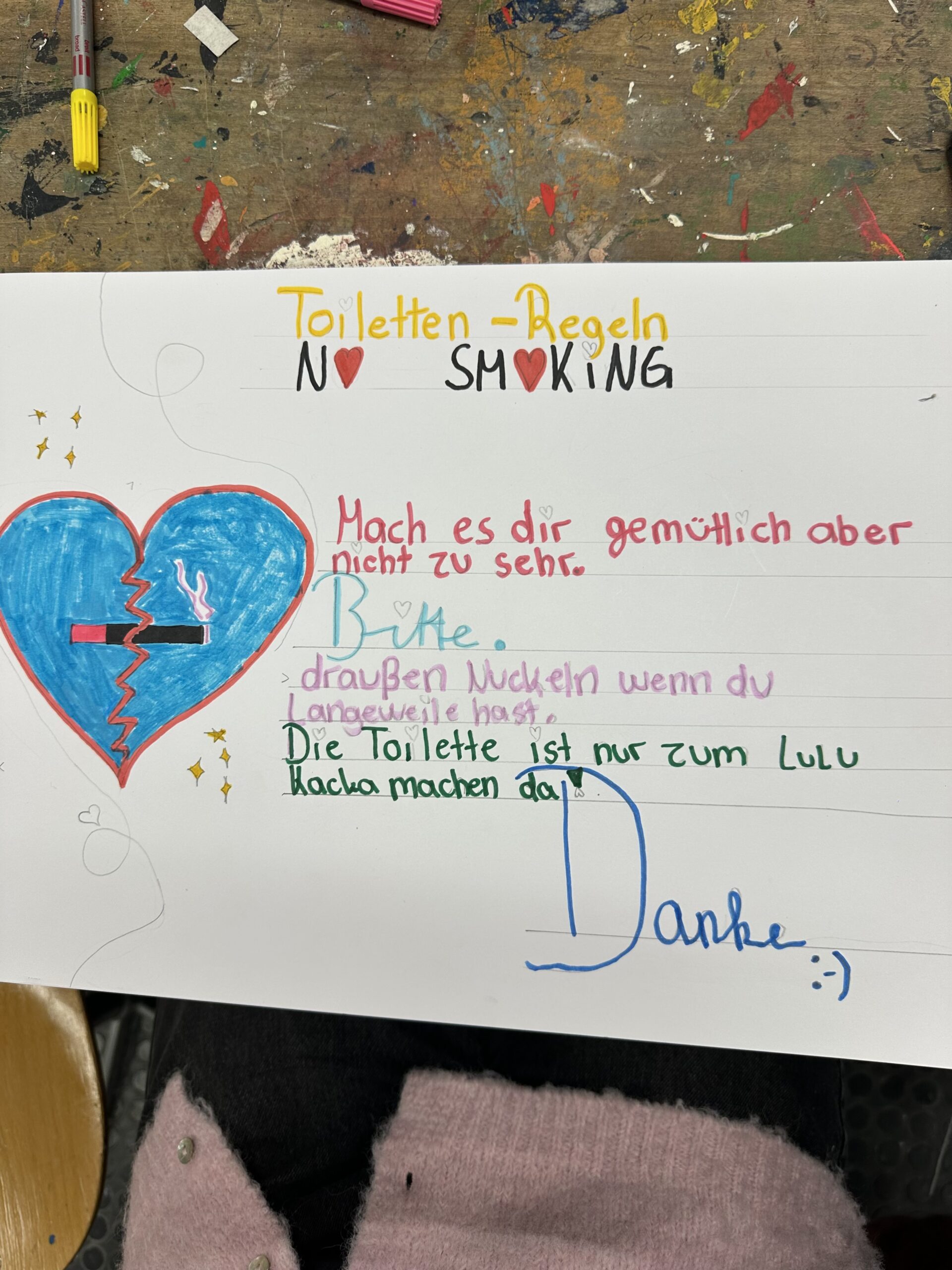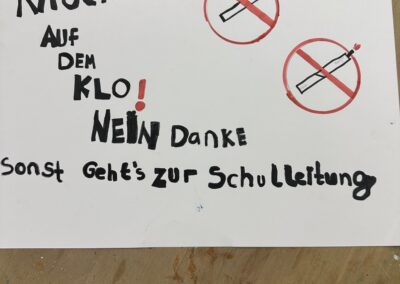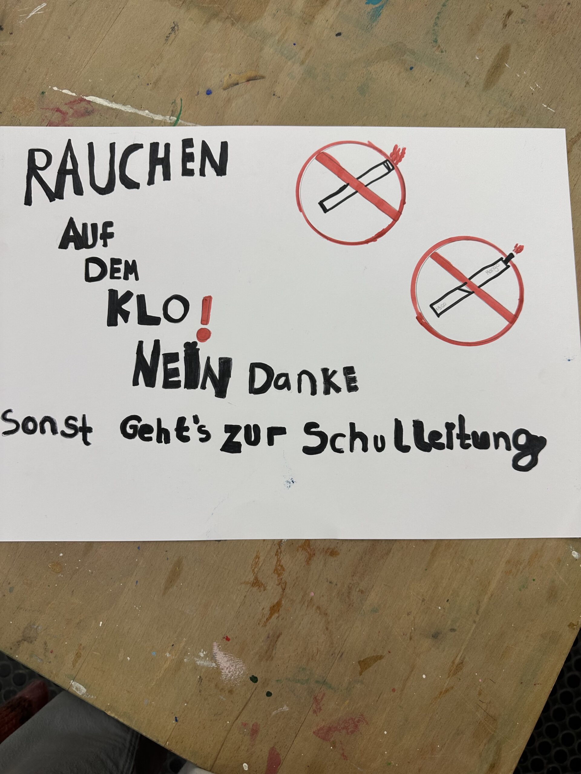 Im Rahmen des Kunstunterrichts gestaltete die Klasse AV1a eine Anti-Raucher Kampagne für die Mädchentoilette. Es entstanden ca. 10 verschiedene Entwürfe, die das „Qualmen auf der Toilette“ unterbinden sollen. Neben Sprüchen, wie „Rauchen macht euch hässlich“, “ Lieber Achmet knutschen als auf der Toilette zu rauchen“ oder „Rauch nicht Brudi, am Ende deine Mutter sieht“ entstanden auch liebevoll gestaltete „Klo-Regeln“ auf den kleinen Plakaten. Was beim Aufhängen der Poster aber vor allem deutlich wurde, ist die Tatsache, dass der Gang auf die Toilette doch deutlich angenehmer wäre, wenn das Toilettenpapier in der Schüssel landen würde und der Edding, genauso wie die Vape oder die Zigarette in der Tasche bliebe. Lasst euch also nicht Erwischen, Ladies – sonst geht’s zur Schulleitung:)
