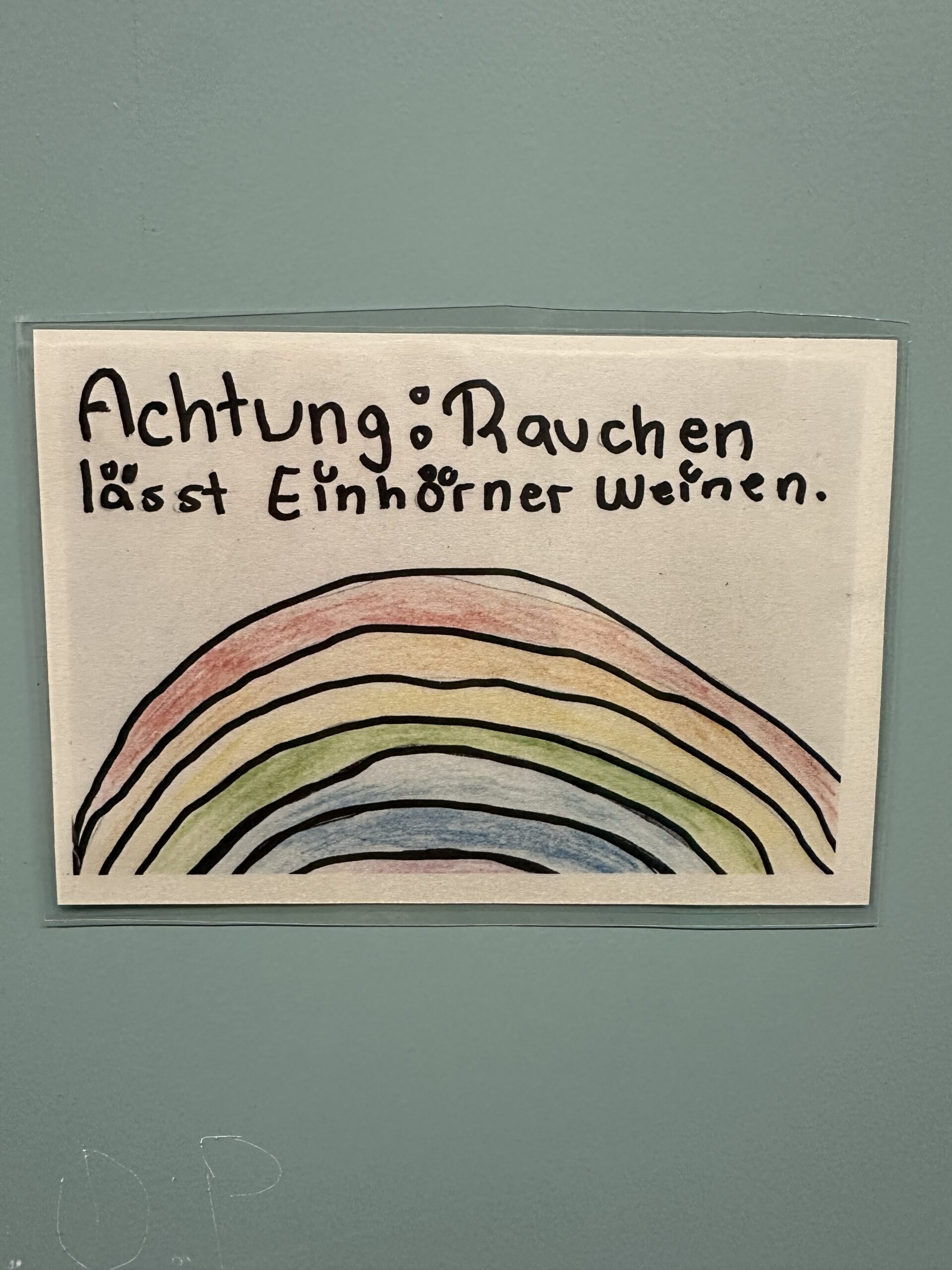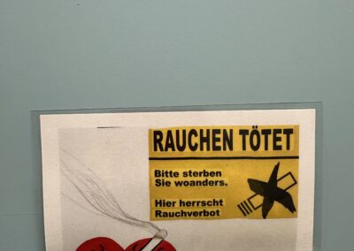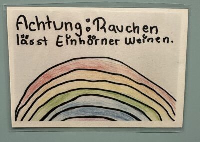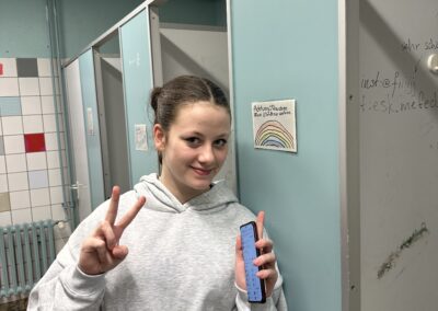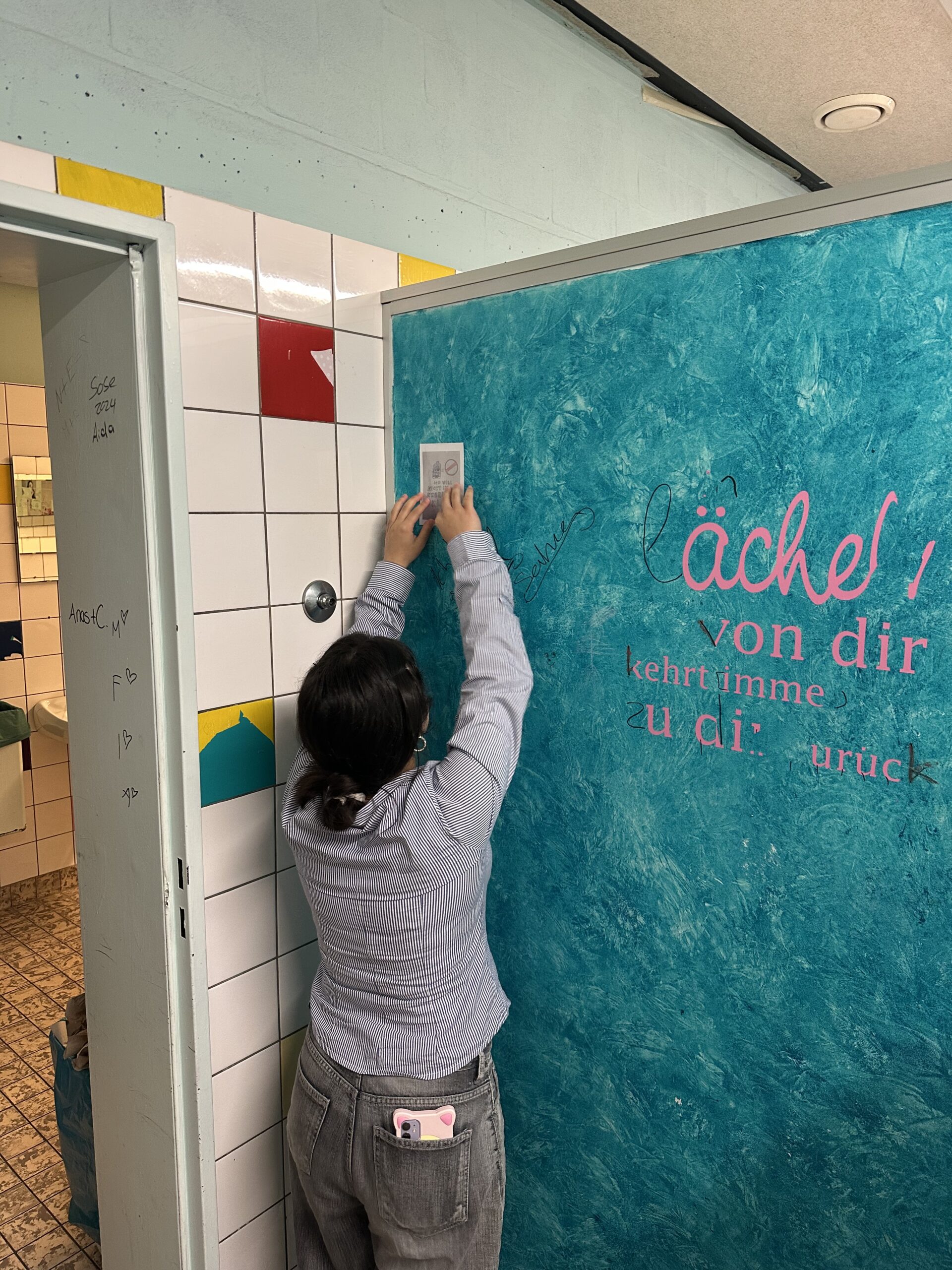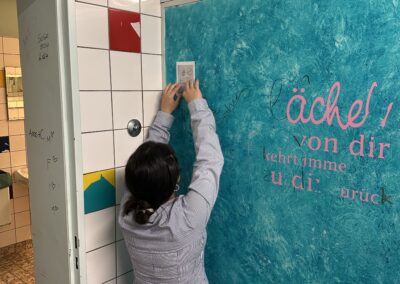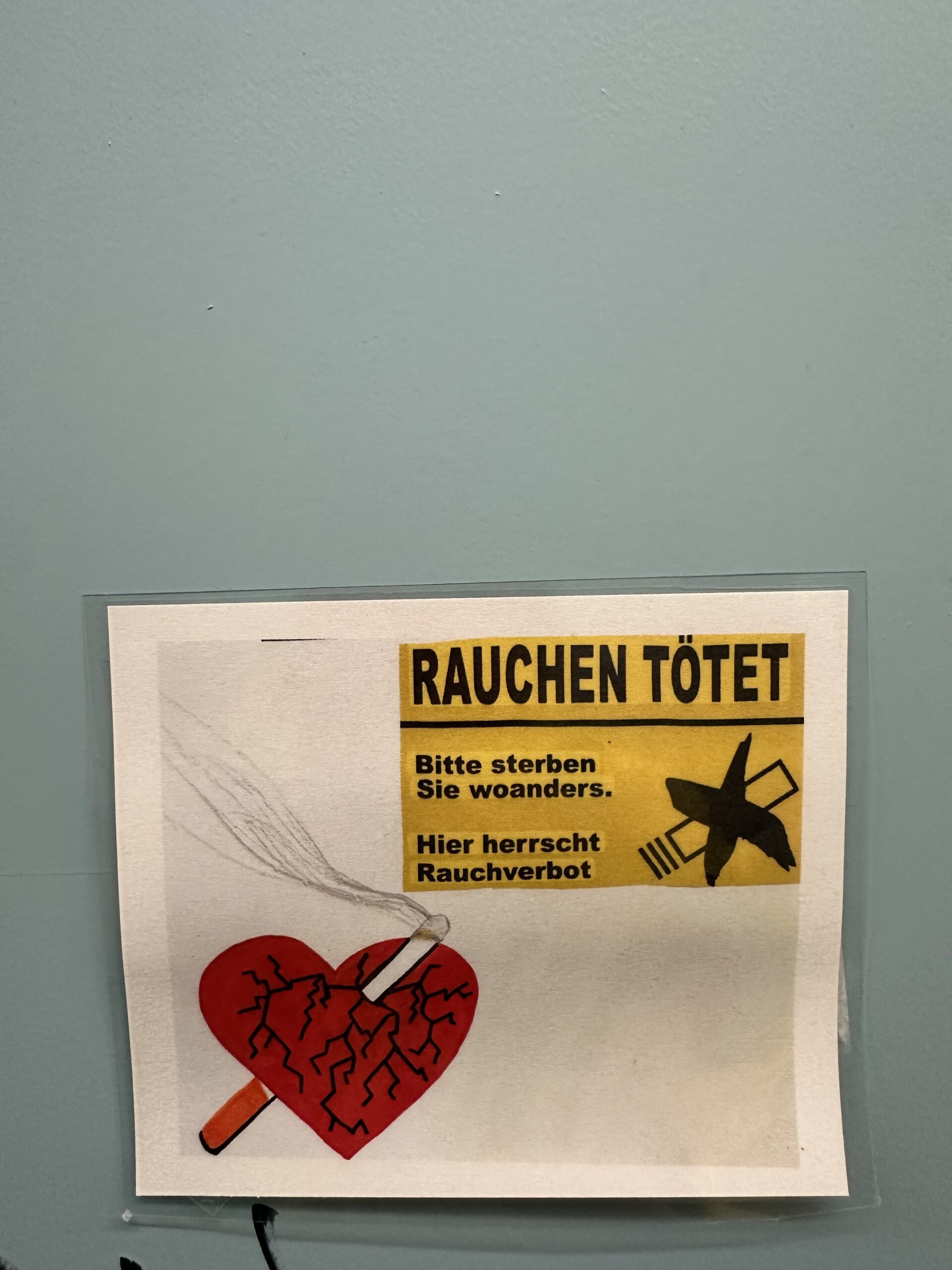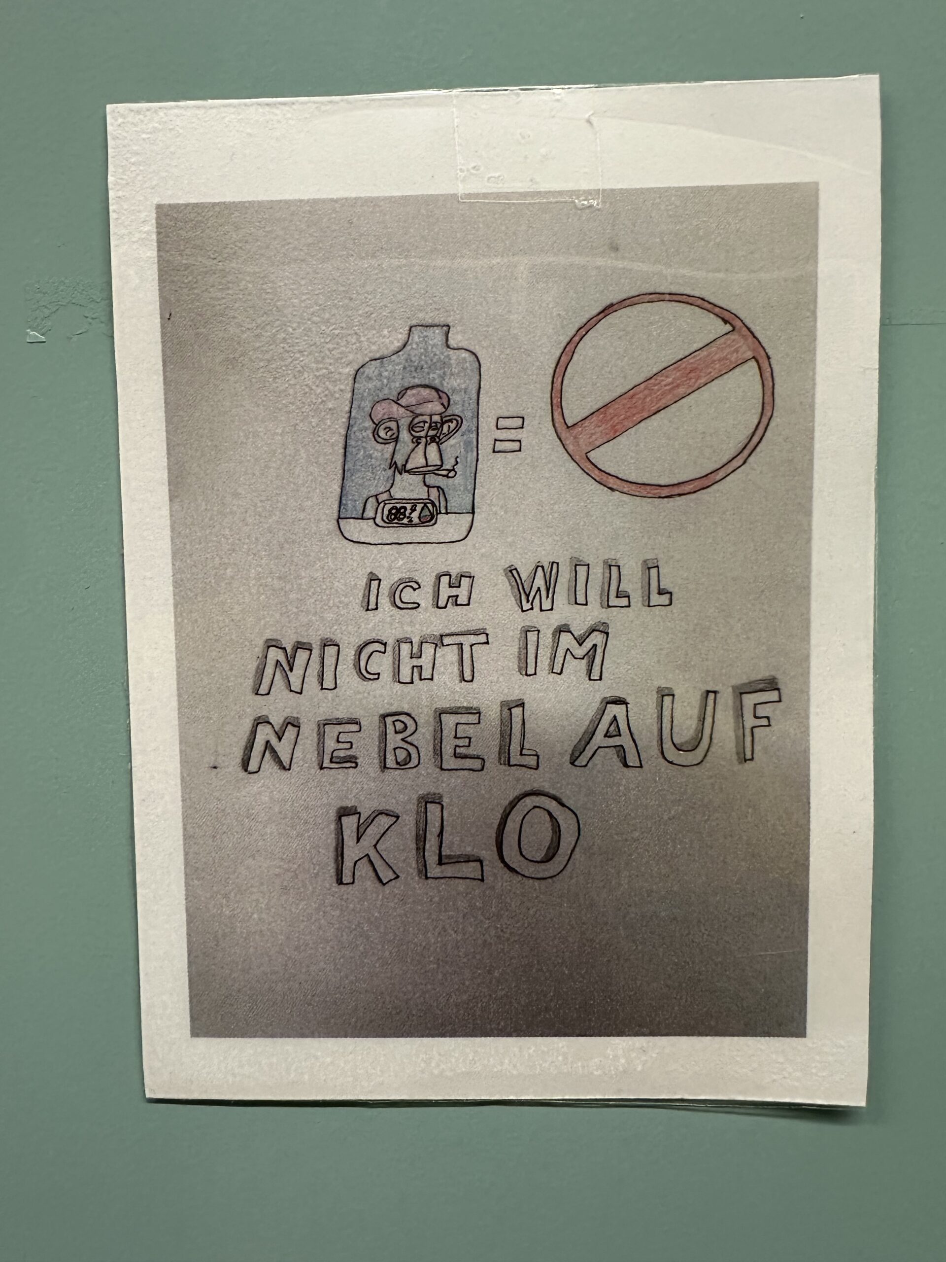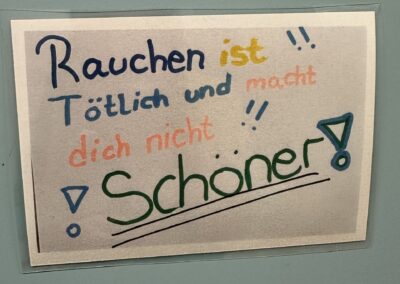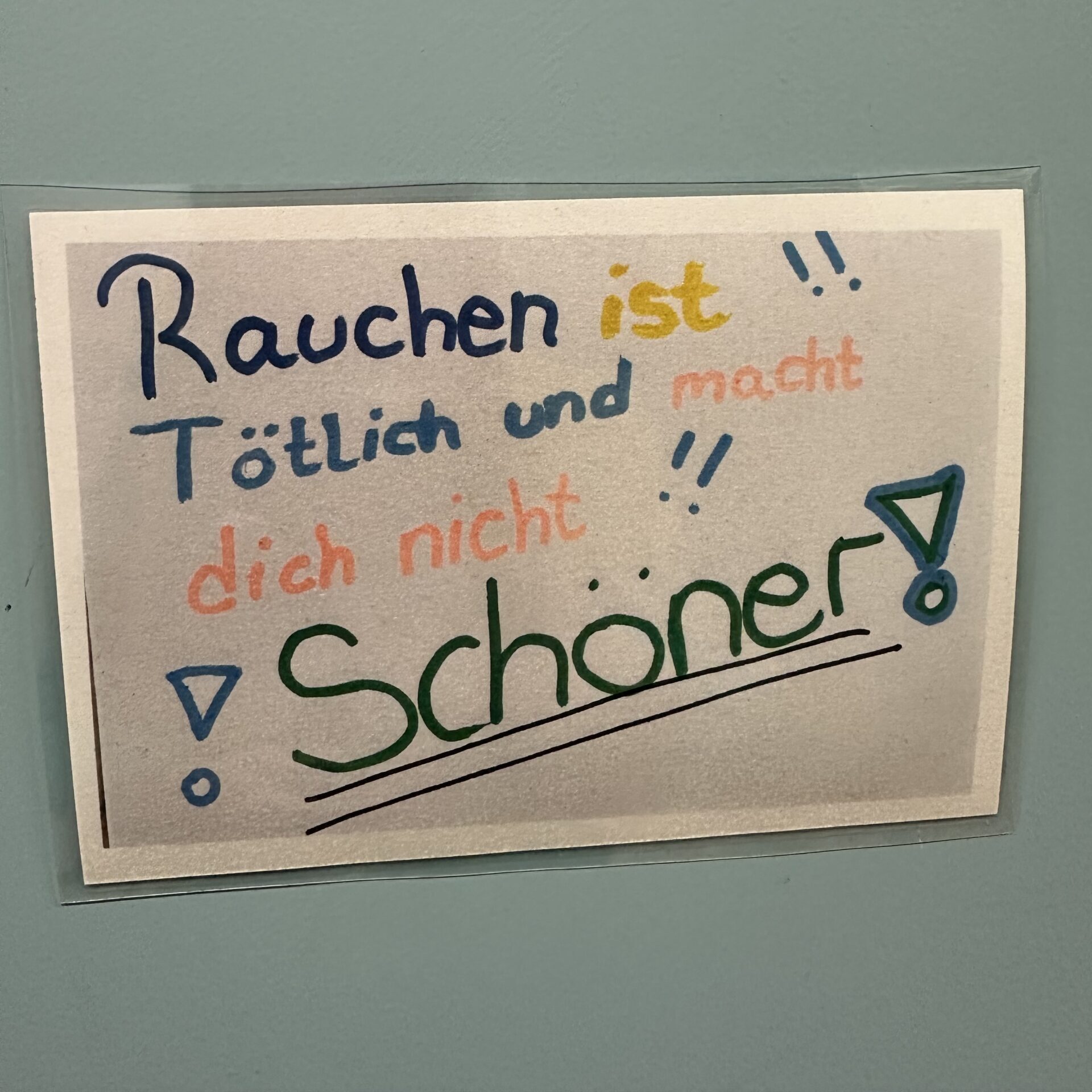 Im Rahmen des Kunstunterrichts gestaltete die Klasse AV1a eine Anti-Raucher Kampagne für die Mädchentoilette. Es entstanden ca. 10 verschiedene Entwürfe, die das „Qualmen auf der Toilette“ unterbinden sollen. Neben Sprüchen, wie „Rauchen macht euch hässlich“, “ Lieber Achmet knutschen als auf der Toilette zu rauchen“ oder „Rauch nicht Brudi, am Ende deine Mutter sieht“ entstanden auch liebevoll gestaltete „Klo-Regeln“ auf den kleinen Plakaten. Was beim Aufhängen der Poster aber vor allem deutlich wurde, ist die Tatsache, dass der Gang auf die Toilette doch deutlich angenehmer wäre, wenn das Toilettenpapier in der Schüssel landen würde und der Edding, genauso wie die Vape oder die Zigarette in der Tasche bliebe. Lasst euch also nicht Erwischen, Ladies – sonst geht’s zur Schulleitung:)