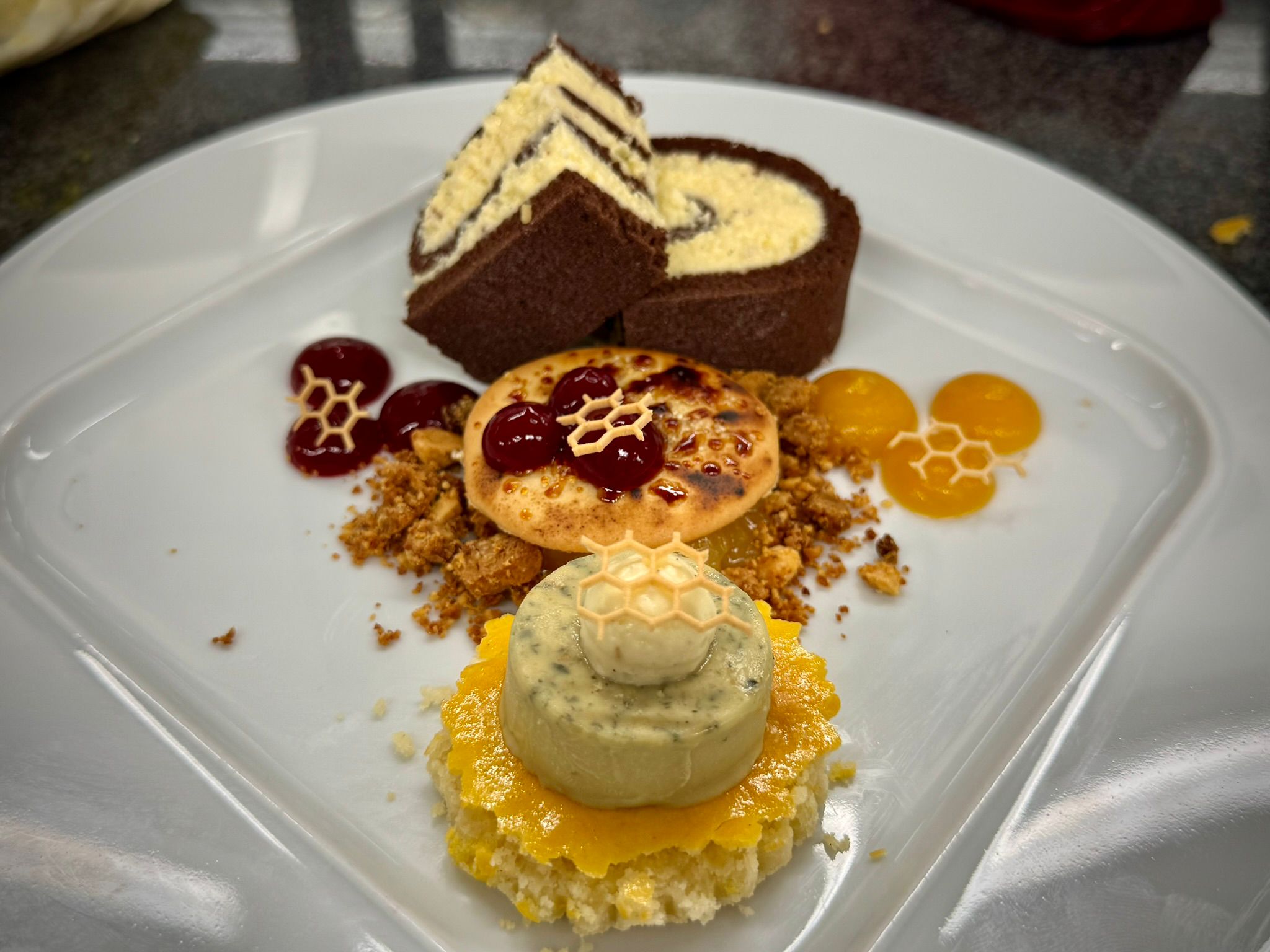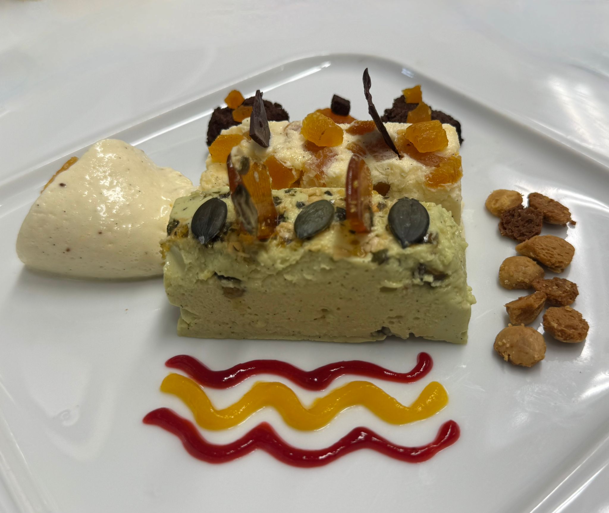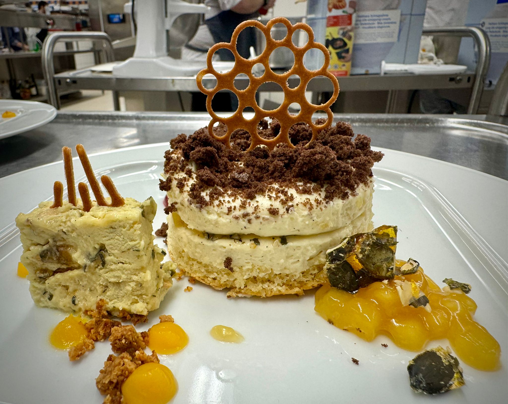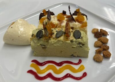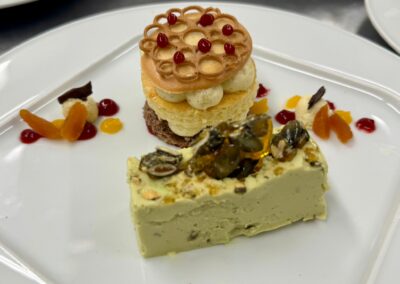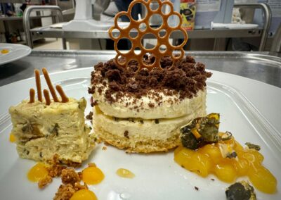 Im Mittelpunkt standen unter anderem die Herstellung von Biskuit- und Hippenmassen, Bayerischer Creme, Kürbiskern- und Aprikosenparfait sowie Mürbeteig. Darüber hinaus wurde das fachgerechte Temperieren von Schokolade intensiv geübt – eine zentrale Kompetenz im Bereich der gehobenen Dessertküche.