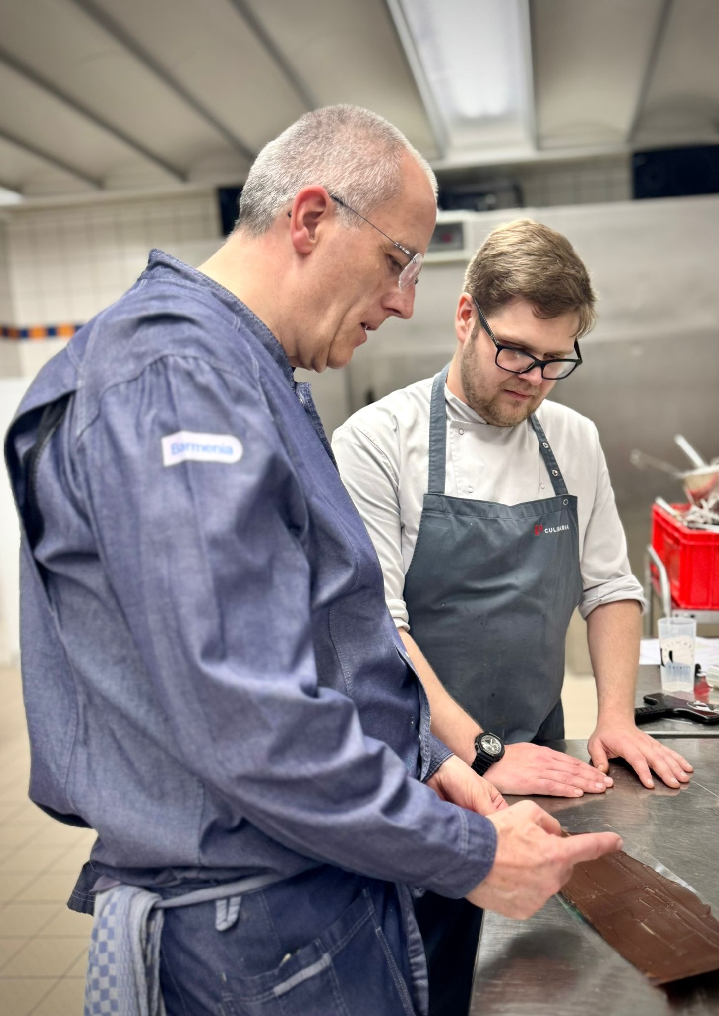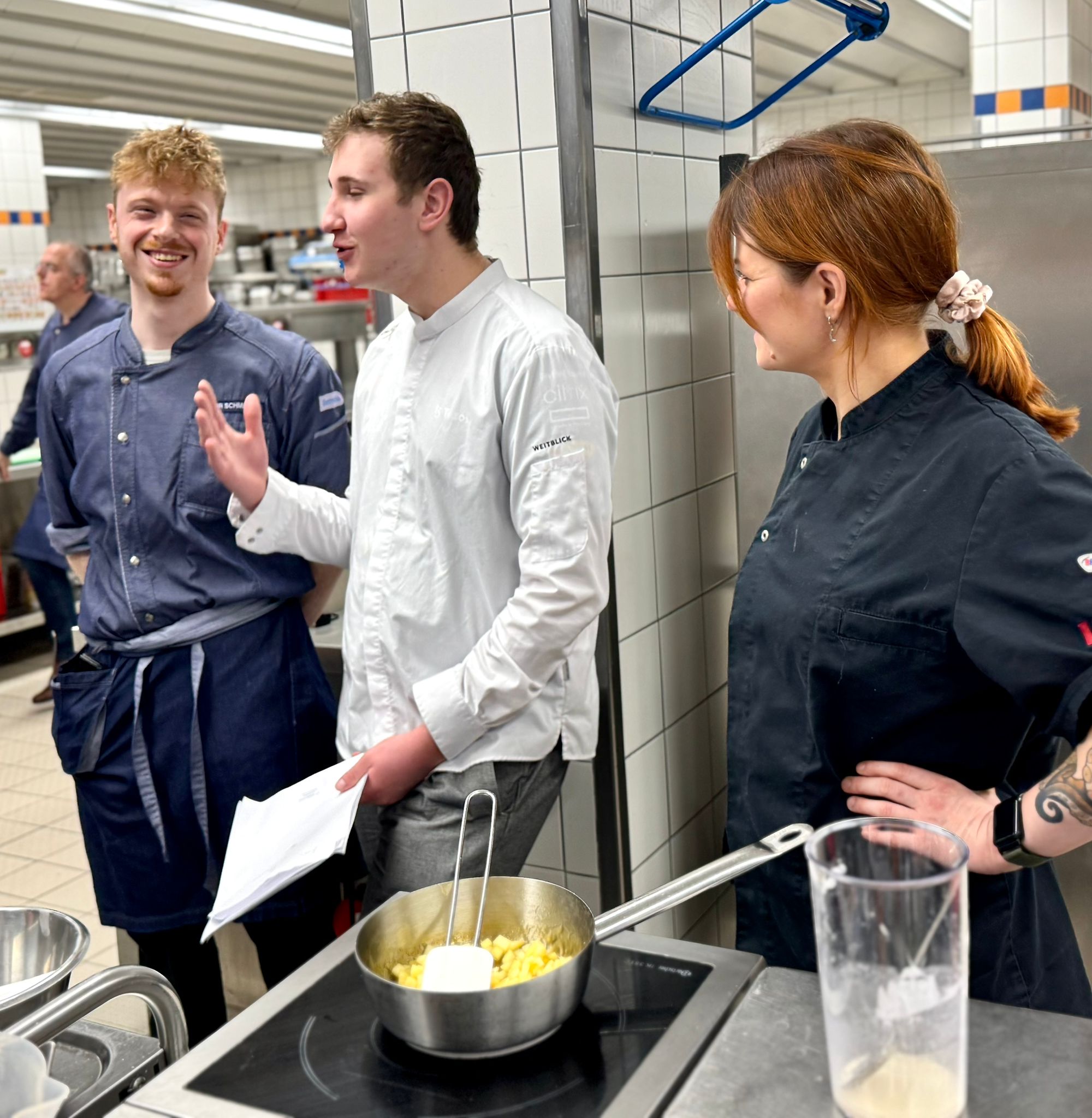 Jürgen Asmus (Küchenchef Barmenia), Mathias Trimborn (Patissier, Freelancer) sowie Louisa Von Dewall (Patissière Culinaria) begleiteten den Workshop mit großem Engagement und fachlicher Expertise. Besonders hervorzuheben ist dabei die Rolle von Louisa Von Dewall, die erst kürzlich ihre Abschlussprüfung mit ausgezeichnetem Ergebnis absolviert hat und in diesem Workshop als Tutorin wertvolle Impulse geben konnte.