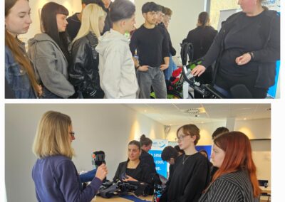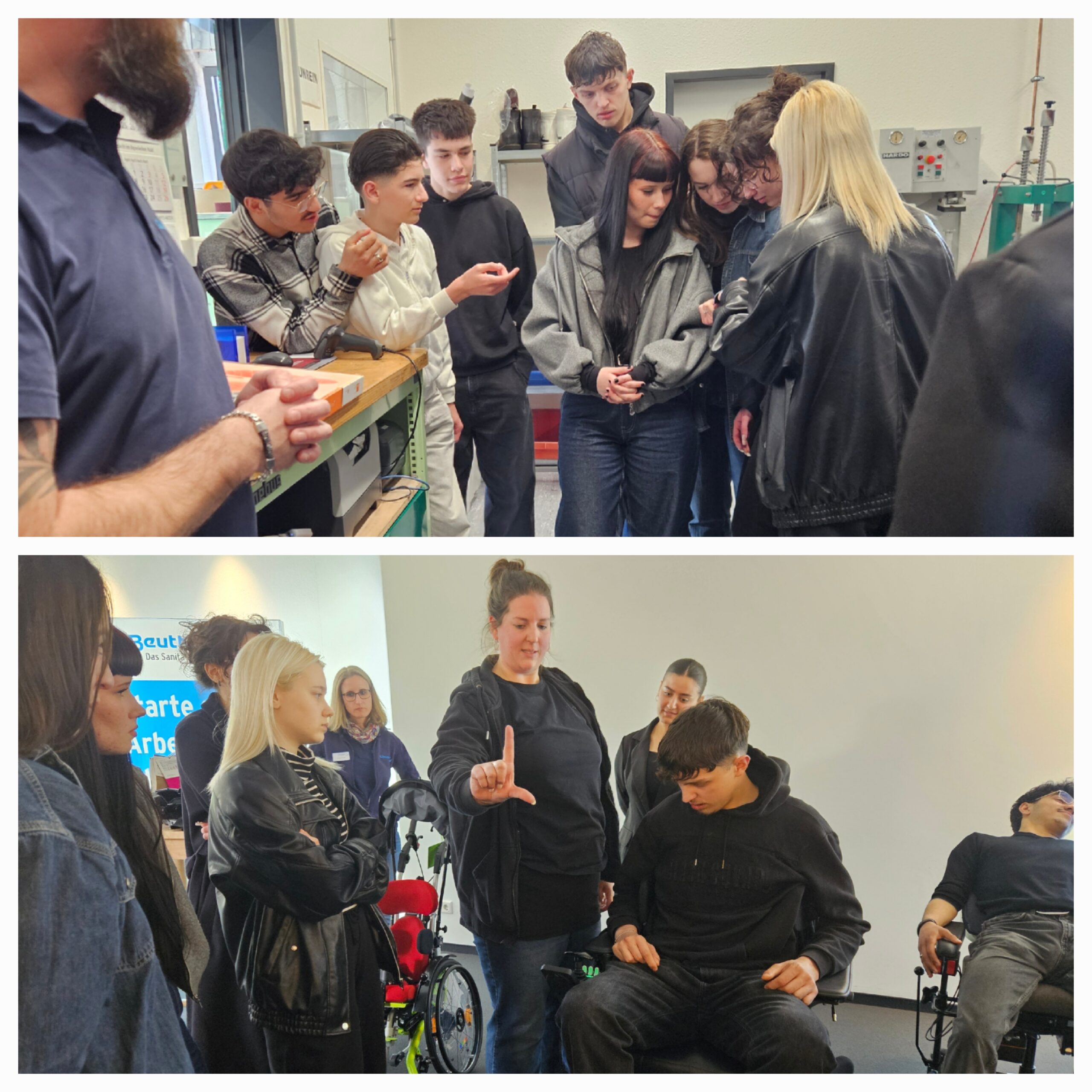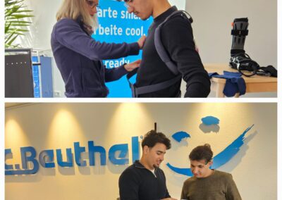 Zu Beginn stellte das Team die verschiedenen Ausbildungsberufe im Betrieb vor und beantwortete offen die Fragen der Schülerinnen und Schüler. Besonders spannend wurde es, als die Gruppe selbst aktiv werden durfte: Hilfsmittel wie Rollstühle, Orthesen und Prothesen konnten nicht nur aus nächster Nähe betrachtet, sondern auch ausprobiert werden. So wurde schnell deutlich, wie wichtig und vielseitig die Arbeit in diesem Bereich ist.